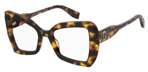 A armação MARC 854 apresenta um arrojado e superdimensionado formato borboleta em acetato de duas camadas, com as hastes adornadas com o detalhe metálico J-Marc e o logo MARC JACOBS com a inscrição embutida. Disponível em Havana e preto/Havana.