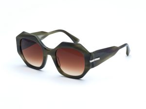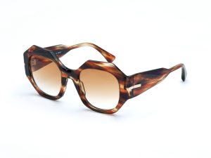 Dois novos estilos da mesma coleção são expressos através de formas e geometrias volumosas. O atraente formato poligonal de Vinigo é esculpido em acetato multifacetado, refletindo a luz com uma intensidade dinâmica e criando um efeito de joia urbana.