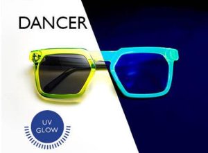 Estes óculos de sol são de acetato amarelo elétrico brilhante. Quando usada em ambientes fechados sob luz azul, por exemplo, numa discoteca, a armação brilha em amarelo neon.