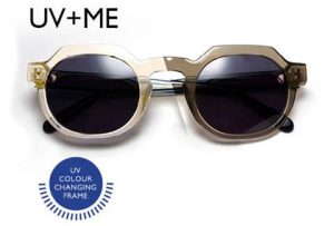 Estes óculos de sol mudam de cor quando apanha sol. De cristal claro quando usado em ambientes internos, a armação muda para cinza cristalino escuro quando sai do sol.
